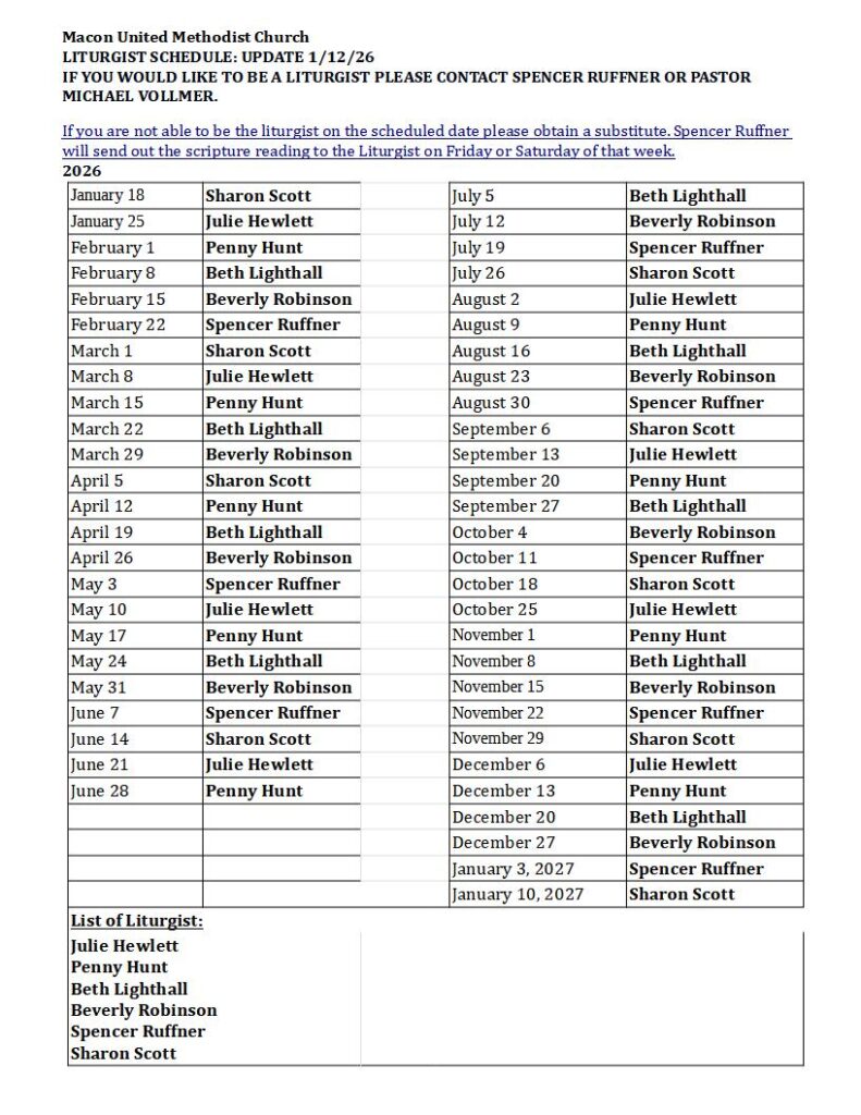 Macon United Methodist Liturgist Schedule: Update 9/1/24 If you would like to be a Liturgist please contact Spencer Ruffner or Pastor Michael Vollmer. If you are not able to be the liturgist on the scheduled date please obtain a substitute and let Spencer Ruffner know by email at ruffnersp@gmail.com or text at 517-215-9292 so I may update the web page and bulletin. Spencer Ruffner will send out the scripture reading to the Liturgist on Friday or Saturday of that week. |